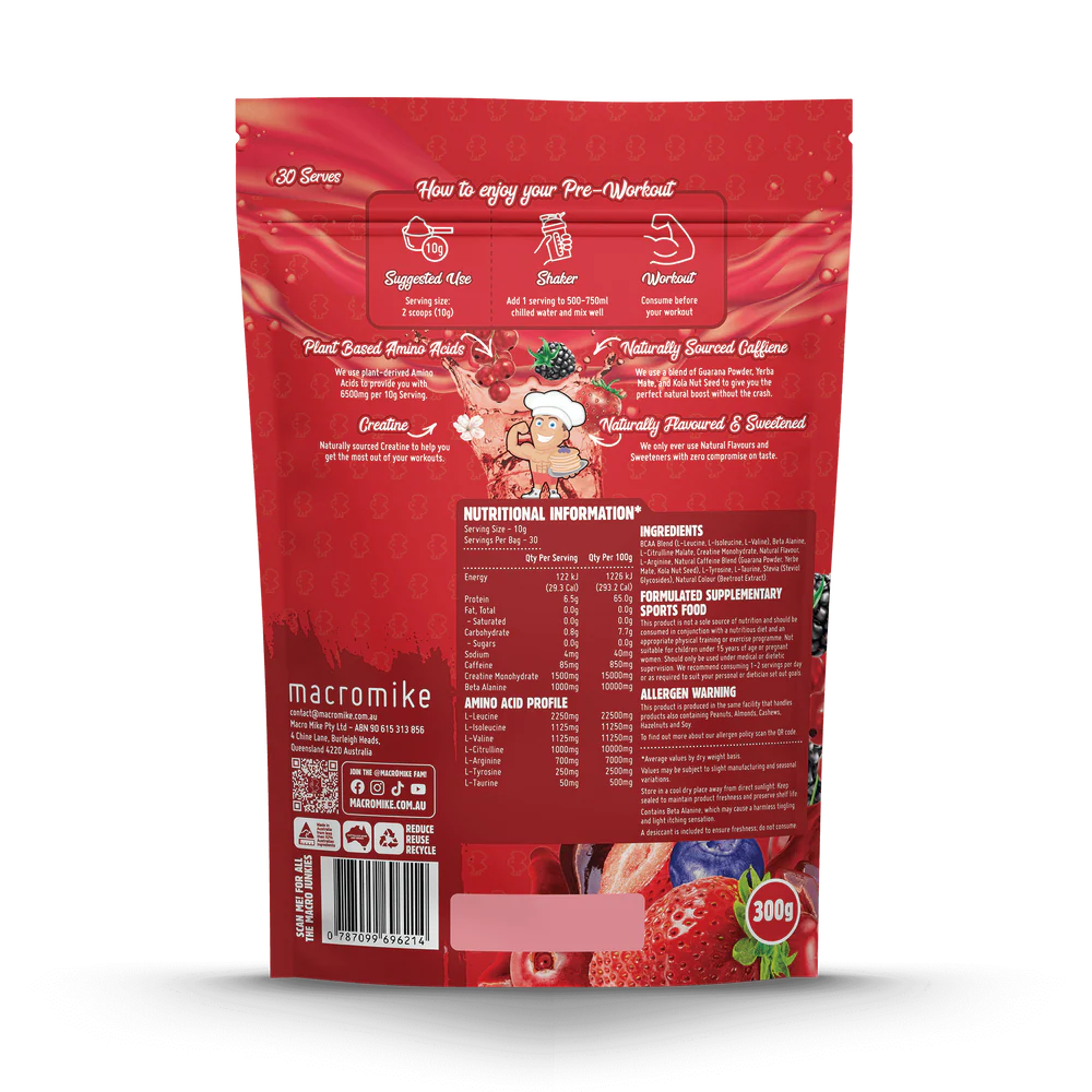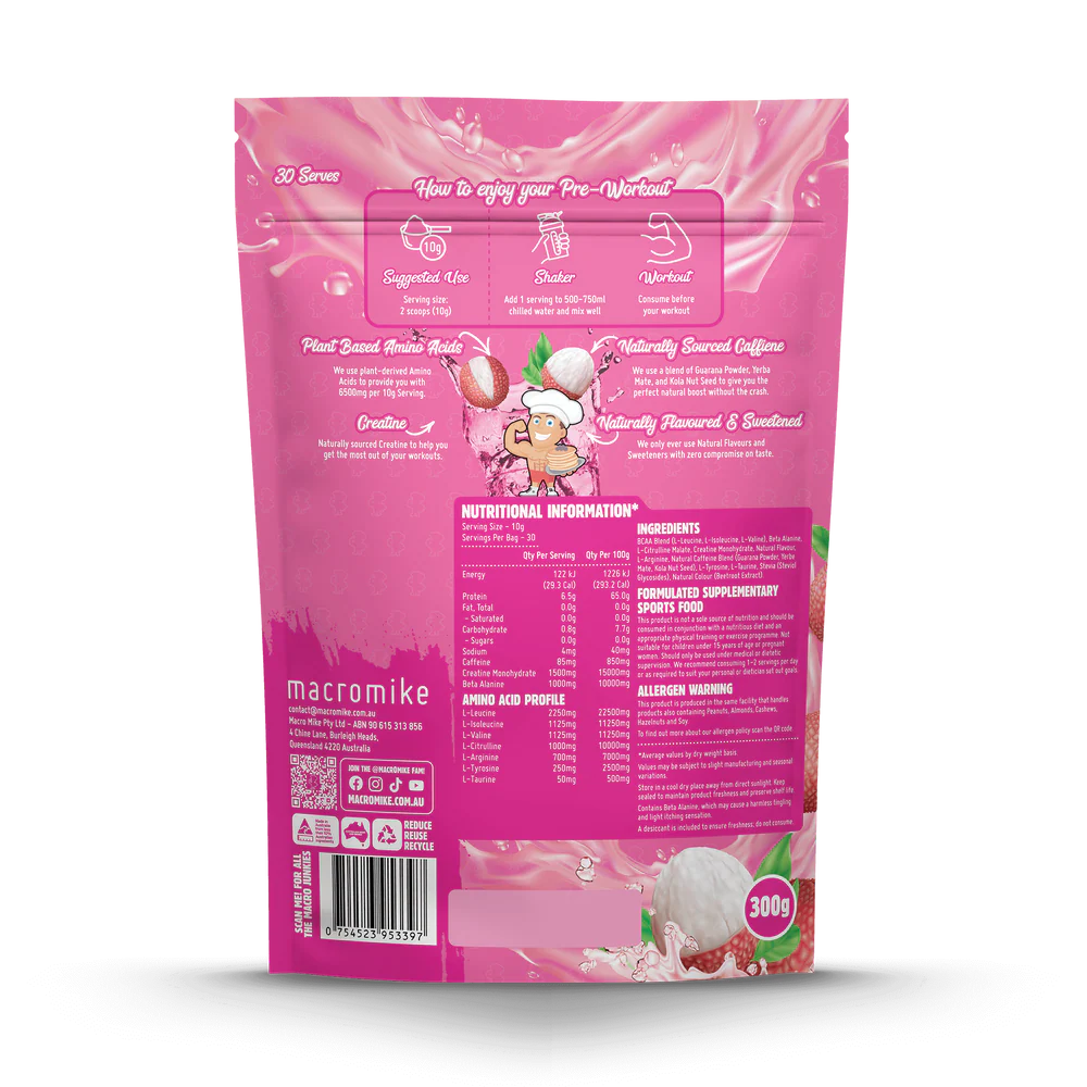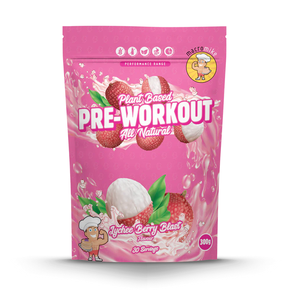 Take your workouts to the next level! This invigorating blend is packed with plant-based amino acids, natural workout boosting ingredients and natural caffeine. Macro Mike's Pre Workout delivers a clean energy boost with no artificial nasties. The vibrant fusion of sweet lychee and juicy berries will power your performance and keep you coming back for more.